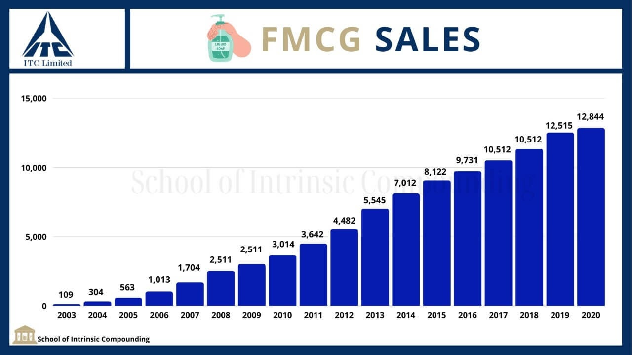 2) ITC Ltd: ITC is a diversified conglomerate that operates in various segments like Cigarettes, Hotels, FMCG and Agri, etc.ITC has taken the cash that it earns in the Cigarette Business and has significantly invested in its FMCG business over the years like Aashirvad, Sunfeast, Yippe Noodles, etc. (takes years to build brands). This is how the sales growth of the FMCG business looks like: