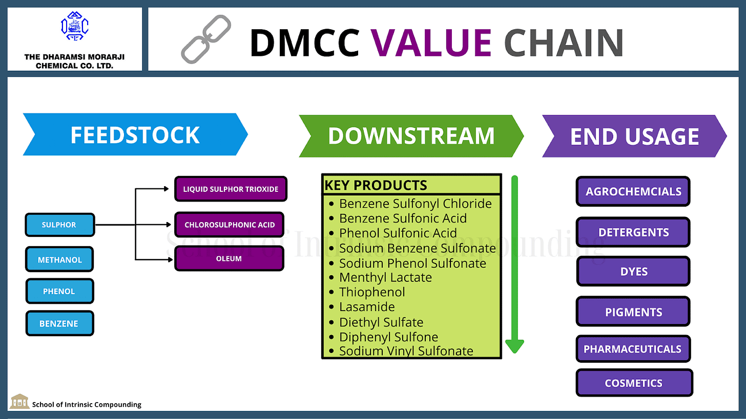 1) Dharamsi Morarji Chemical Company: there is a little known chemical company that has expertise in sulphur chemistry listed on BSE. DMCC was founded in 1919, with just one product and one manufacturing unit. It began its journey as a manufacturer of Sulphuric acid and Single Superphosphate Fertilizer. Throughout the last century, DMCC was focused on the fertilizer business which contributed 75% to the sales. However, in 2005 it started incurring losses and decided to exit the business. Under the new leadership of Bimal Goculdas, DMCC started focusing on the sulphur chemicals business and its downstream products which were lower competition but higher margin in nature. This is how the value chain looks like: