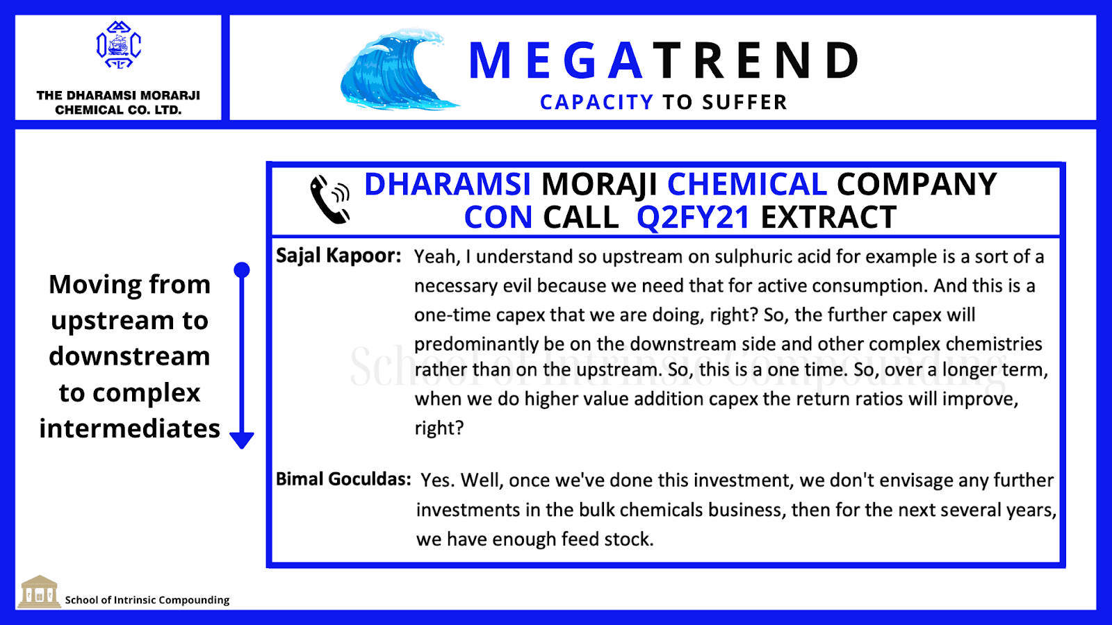 Let’s see how we can apply the capacity to suffer framework over here. Recently the company has announced a capex worth 100 crores,(currently has fixed assets of 100 crores). Out of the 100 crores capex, 50 crores is being spent on the bulk chemical segment (sulphuric acid). Setting up the capacity for bulk chemical becomes important as this will help the company to take care of its feedstock. Then to use this feedstock to move downwards in the value chain into the products that will be higher margin in nature. In the short term, the proportion of Bulk chemical business will increase and this will lead to contraction in the margins, but in the long run. This capex will take care of the feedstock requirement of the company for the next decade, this will allow the company to focus increasingly more on the downstream products that will be higher margin in nature. Mr. Market is clearly giving the valuations of a bulk chemical company. On the other hand, the thought process of moving downstream seems pretty clear after the requirement of feedstock is taken care of.