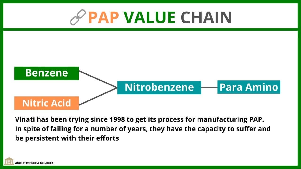 The culture of persistence and the capacity to be patient is displayed by another of their products by the name of Para Amino Phenol. PAP is an n-1 intermediate used to manufacture Paracetamol which is a widely used pain reliever. Vinati has been granted a patent for a unique one-step reaction to manufacture PAP.