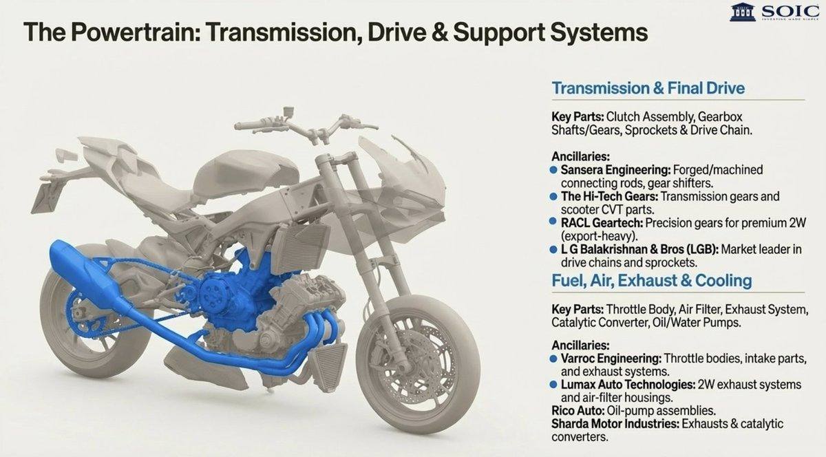 The Transmission & Final Drive ensures power reaches the wheel, involving the clutch assembly, gearbox shafts/gears, sprockets, and the drive chain. Sansera Engineering provides critical forged and machined components like connecting rods and gear shifters. For the final drive, L G Balakrishnan & Bros (LGB) is essential, supplying complete drive and timing chain kits and sprockets. Furthermore, precision gear manufacturers like The Hi-Tech Gears and RACL Geartech (Often export-heavy, focusing on premium motorcycles) supply transmission components.