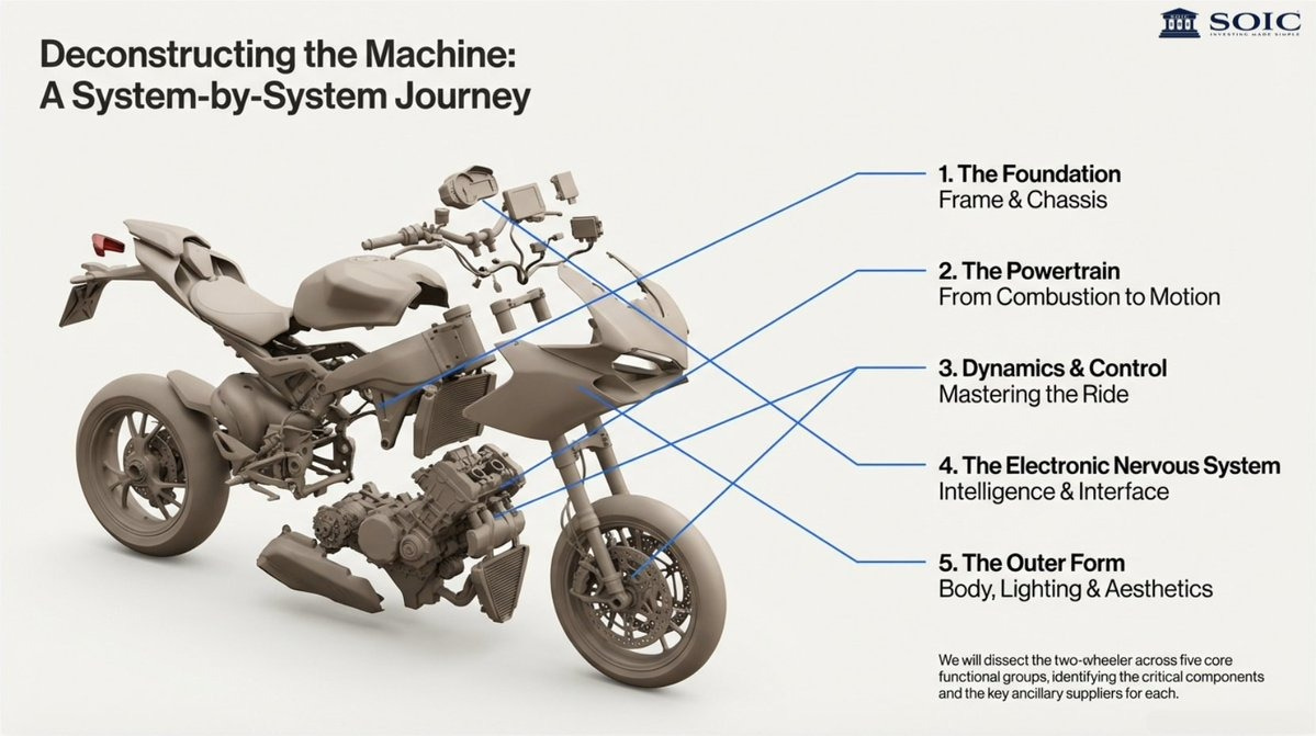 The two-wheeler (2W) industry operates on a highly segmented value chain, encompassing sixteen distinct subsystems that define everything from structural integrity to advanced electronic controls. An analytical breakdown reveals specialized component mapping and highlights the dominance of key Indian ancillaries that serve both traditional internal combustion engine (ICE) models and emerging electric vehicle (EV) platforms.
