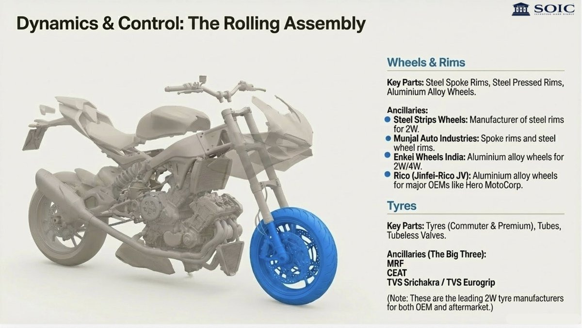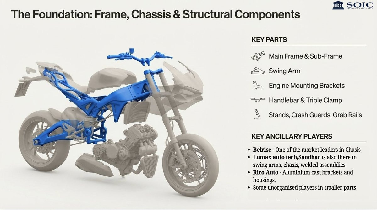 The foundation of any 2W is the Frame & Chassis, which includes the main frame, swing arm, handlebar, and engine mounting brackets. Key players here include Belrise, Lumax Auto Technologies, Sandhar which focuses on chassis parts and welded assemblies, and Rico Auto, supplying aluminium cast brackets.