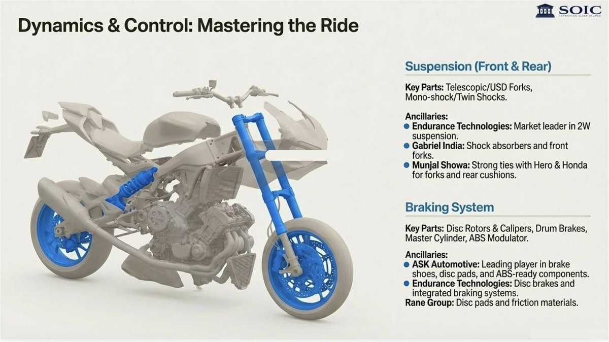 In the crucial area of dynamic control, the suspension system features telescopic/USD front forks and rear shock absorbers. Endurance Technologies is identified as the market leader in 2W suspension, supplying front forks and mono-shocks. Gabriel India and Munjal Showa are also strong suppliers of shock absorbers, the latter having robust ties with OEMs like Hero and Honda.