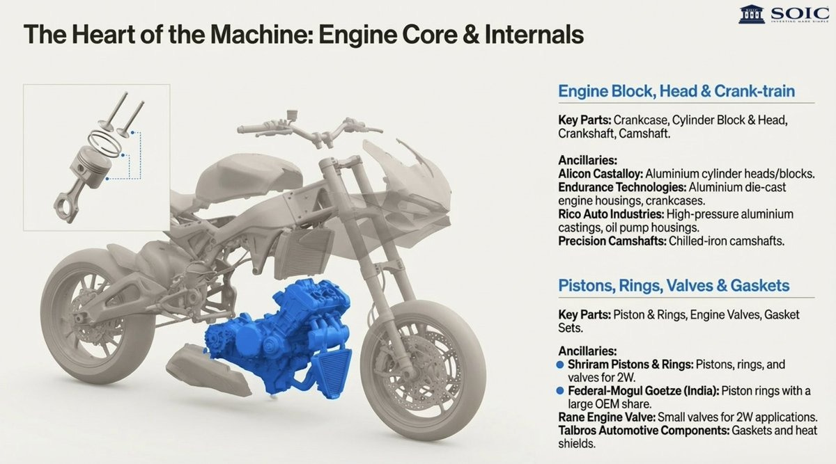 The Engine Core itself is complex, covering crankcase halves, cylinder heads, and the crank-train (crankshaft, camshaft). Expertise in high-precision aluminium casting is essential. Alicon Castalloy provides aluminium cylinder heads, blocks, and crankcases, while Endurance Technologies is critical for aluminium die-cast engine housings and structural castings. Rico Auto Industries also plays a significant role, supplying high-pressure aluminium castings, including oil pump housings, often to Hero MotoCorp.
