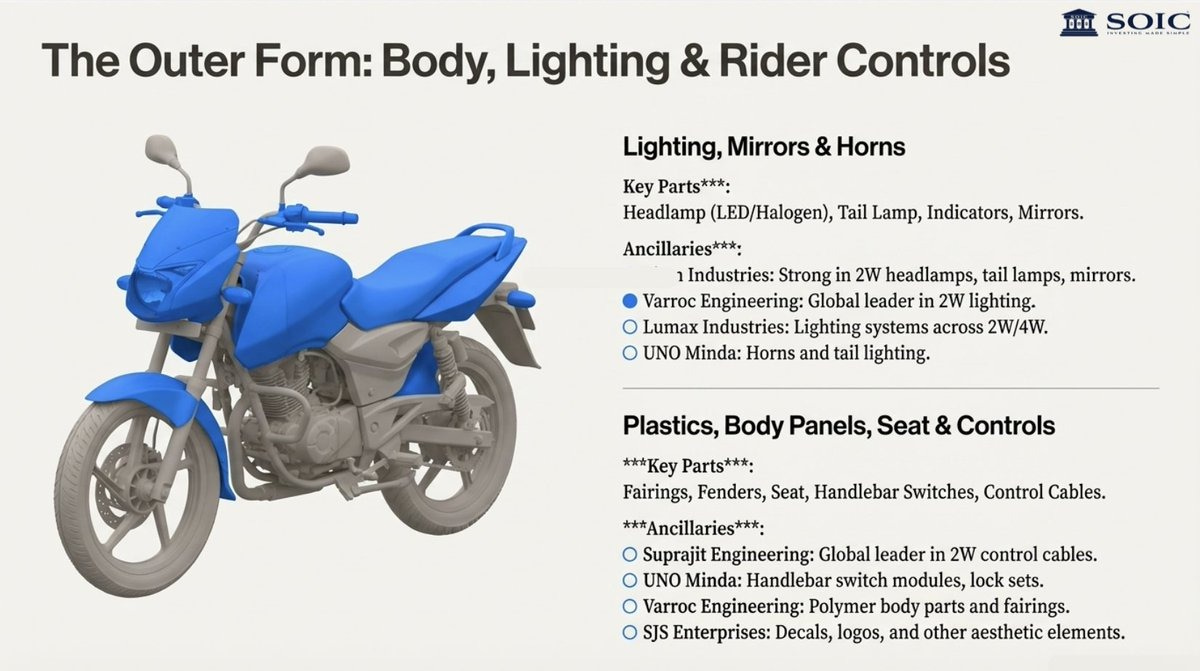 Finally, Plastics, Body Panels, Seat & Luggage define the vehicle’s aesthetics and utility. Varroc Engineering and Lumax Auto Technologies are key suppliers of polymer body parts and fairings. Aesthetic components like decals, logos, and cover displays are supplied by SJS.