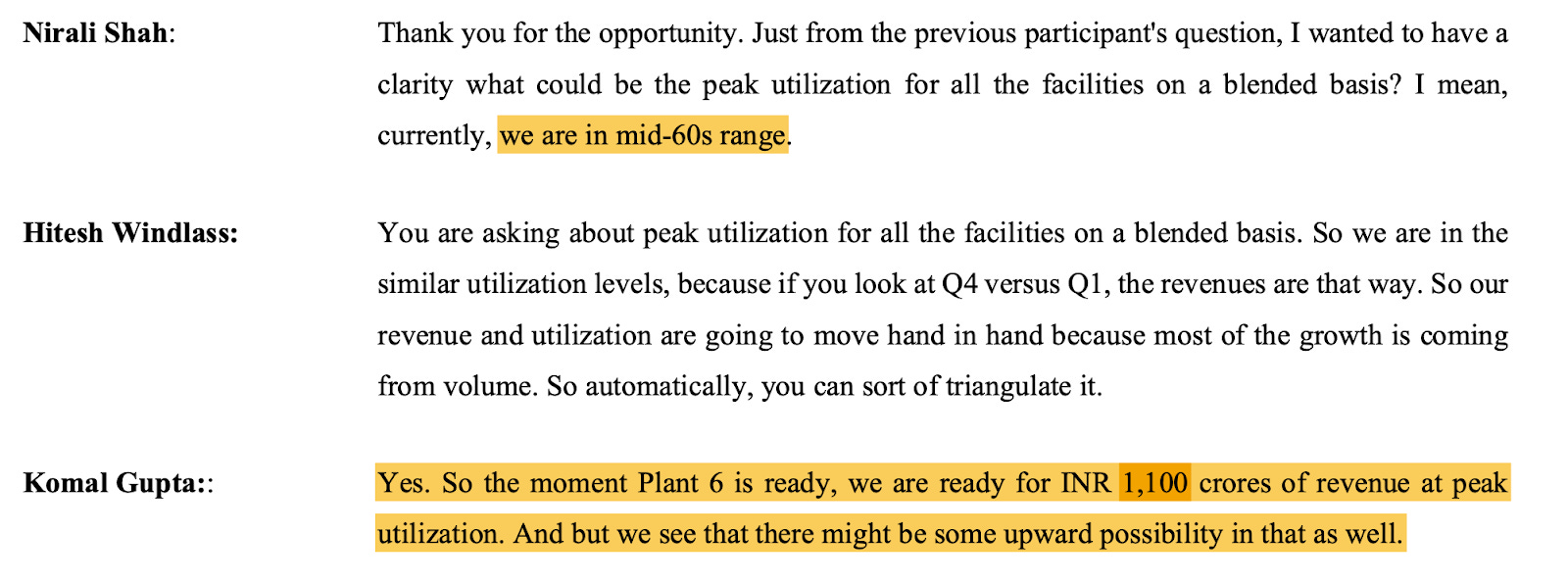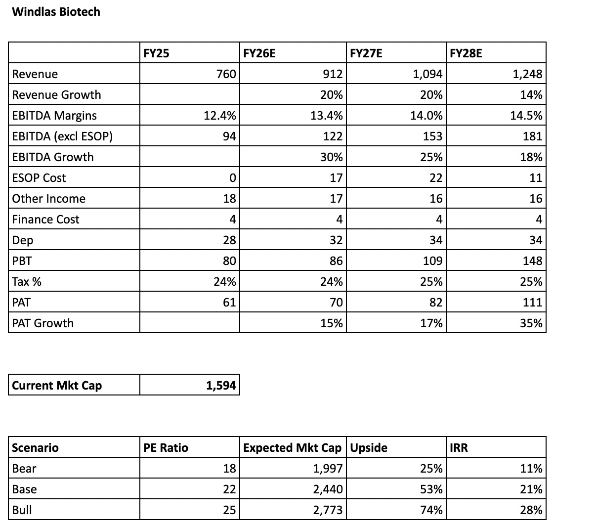 On the revenue side, management has guided that at full utilisation of the existing capacities, Windlas can do around ₹1,100 crore of annual topline, and they have hinted at an upward revision to this number as the business scales and new lines stabilise. Based on our reading of the business, capacity additions and ramp up in injectables, we expect the company to reach near optimal utilisation by FY27. Beyond that, the planned acquisition by FY28 can provide the next leg of growth over and above this base.