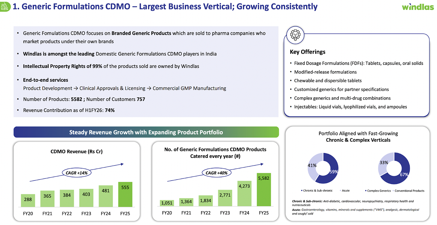Windlas has built a strong reputation in this field, counting 15 of India’s top 20 pharmaceutical companies among its CDMO clients. In practice, many well known pharma brands rely on Windlas to produce some of their tablets, capsules, syrups, etc. Windlas’s four formulation plants in Dehradun and the new injectable plant enable it to handle large volumes and complex projects. Notably, about 67% of the products Windlas makes in its CDMO segment are “complex generics”, these are harder to manufacture medicines such as specialized formulations or novel dosage forms. Focusing on complex generics gives Windlas an edge, as it can offer niche and high value capabilities to clients (for example, modified release tablets, fixed dose combinations, or other technically challenging products). By H1FY26, the company’s CDMO customer base had grown to 757 clients (up from 143 in FY20), reflecting its broad reach in the market.