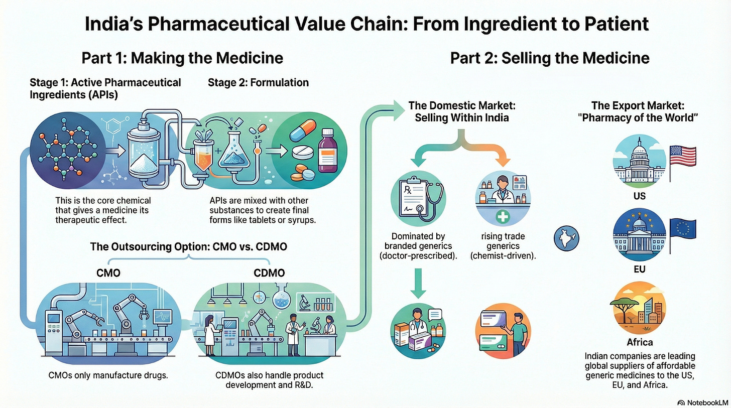 It’s common for big pharma players to straddle both segments: e.g., Sun Pharma not only sells branded generics in India (it has brands like Revital, a supplement, or various prescription brands), but also supplies generics to the US (it even owns Taro Pharmaceuticals in the US). Cipla is another well known in India for inhalers and HIV drugs (domestic and emerging markets), but also selling generic medicines in the US and EU. In summary, formulators are the ones turning chemical ingredients into actual pills and syrups. They are central in the value chain, as they create the form of the drug that patients ultimately use.