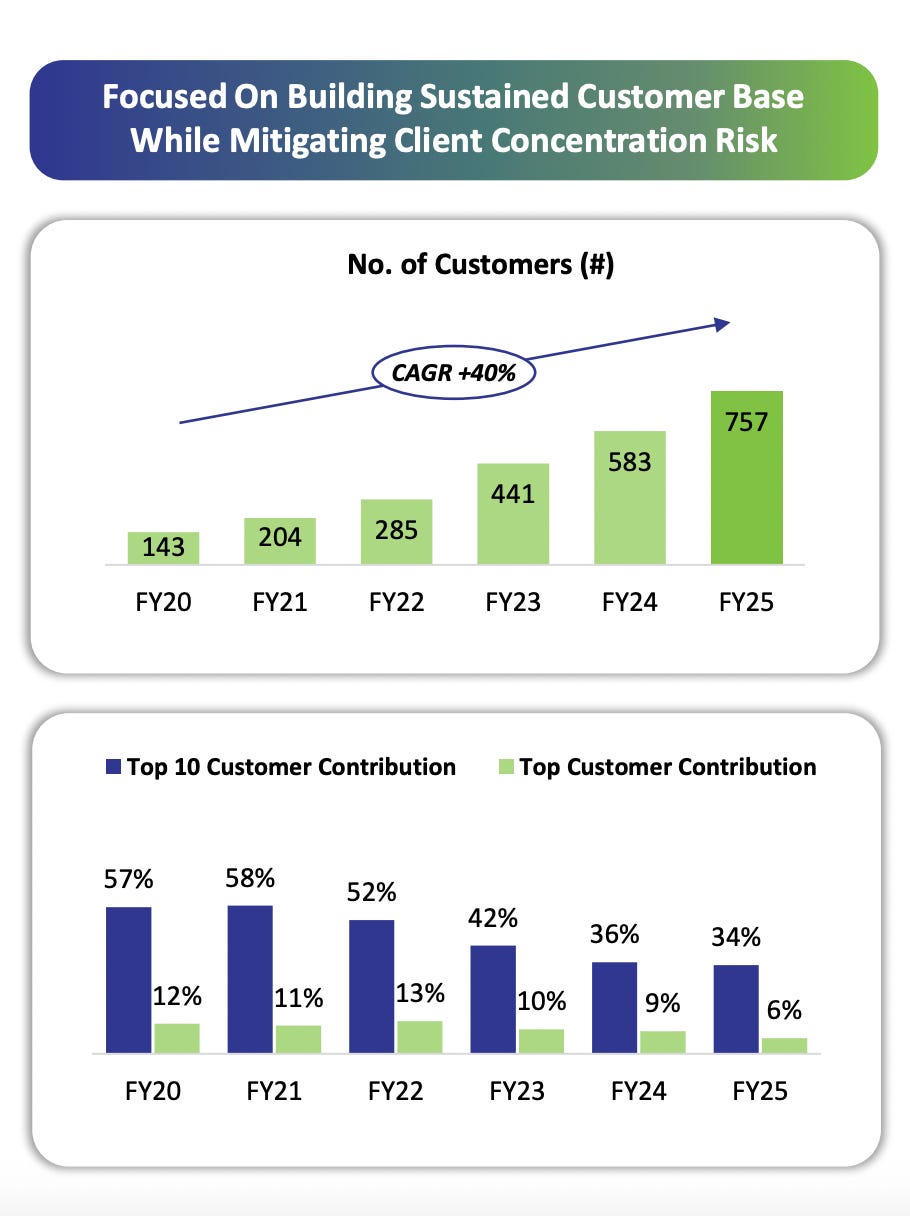 Windlas’s core CDMO segment (73% of FY25 revenue) is on a strong growth trajectory. The company has steadily added new clients and products, which has broadened its customer base and reduced dependence on a few big clients. Windlas now serves 757 customers (including 7 of India’s top 10 pharma firms) with over 5,500 brand formulations, and its top 10 customers account for only 34% of revenue (down from 57% levels in FY20). Management emphasizes that they have been “consistently adding customers, reducing customer concentration, adding our product portfolio in all verticals,” reflecting a deliberate strategy to diversify revenue streams.