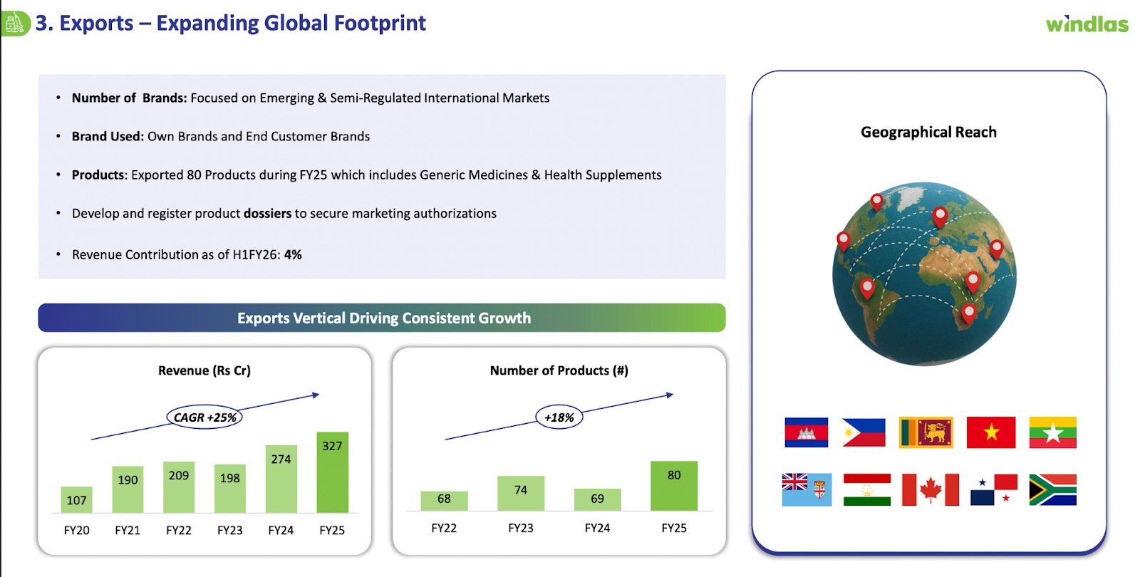 Segment Performance: Currently, exports are the smallest of Windlas’s three segments in revenue terms contributing only about 4% of total revenue in H1FY26. However, it is growing at a fast clip. In FY25, Windlas’s export revenue was marked a 20% growth over the prior year’s export revenue. While the absolute figure is modest, the high growth rate indicates that Windlas is gradually gaining traction internationally. The company’s efforts to widen its geographic reach are evident: it is filing dossiers (regulatory applications) to register more of its products in various countries, aiming to enter new markets in Asia, Africa, and Latin America. By broadening its presence, even in semi regulated regions, Windlas diversifies its revenue and can tap into additional demand.