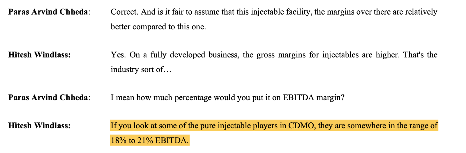 On the economics, management has indicated that for a domestic injectable CDMO plant, a gross asset turn of around 1.1 to 1.2 times is a reasonable assumption, compared with roughly 3 times on the oral solids side. At the same time, injectables are expected to have higher EBITDA margins, in the range of about 18 to 21 percent at steady state, once the plant reaches stable utilisation. Today, margins look lower because fixed operating costs like quality, air handling and compliance are already in place while volumes are still ramping up. As more CDMO and trade generic injectable products move from validation to commercial scale, utilisation should move up towards management’s targeted levels and the plant can deliver operating leverage, helping both growth and profitability for Windlas.
