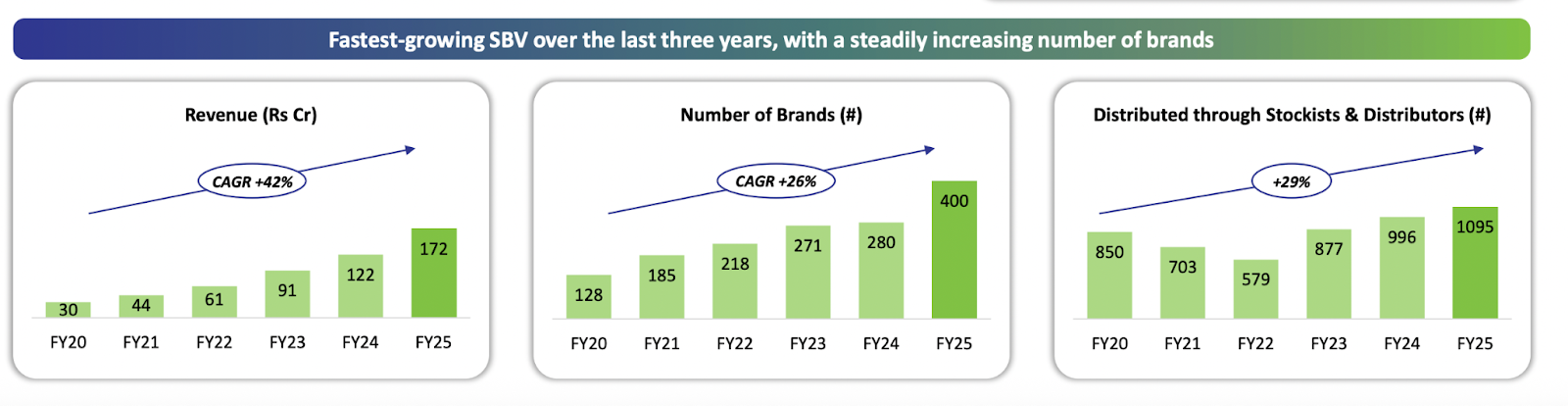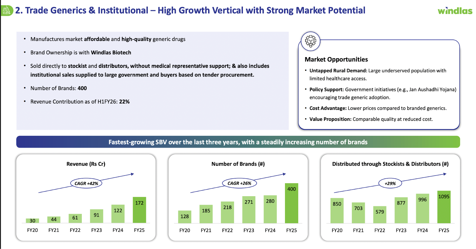 Windlas has built a high growth Trade Generics business (unbranded generic medicines sold under its own brands) which contributed 22% of H1FY26 revenue. This segment has grown at over 40% CAGR in the past 5 years, driven by an expanding product portfolio and wider distribution reach. The company now markets around 400 generic brands across 29 states, distributed through 1,095+ stockists on a direct to stockist model. (Notably, sales in this channel are not dependent on a field force of medical representatives, which makes it an efficient, scalable model.) By continuously launching new affordable products and adding distributors, Windlas has significantly penetrated underserved rural and semi urban markets.