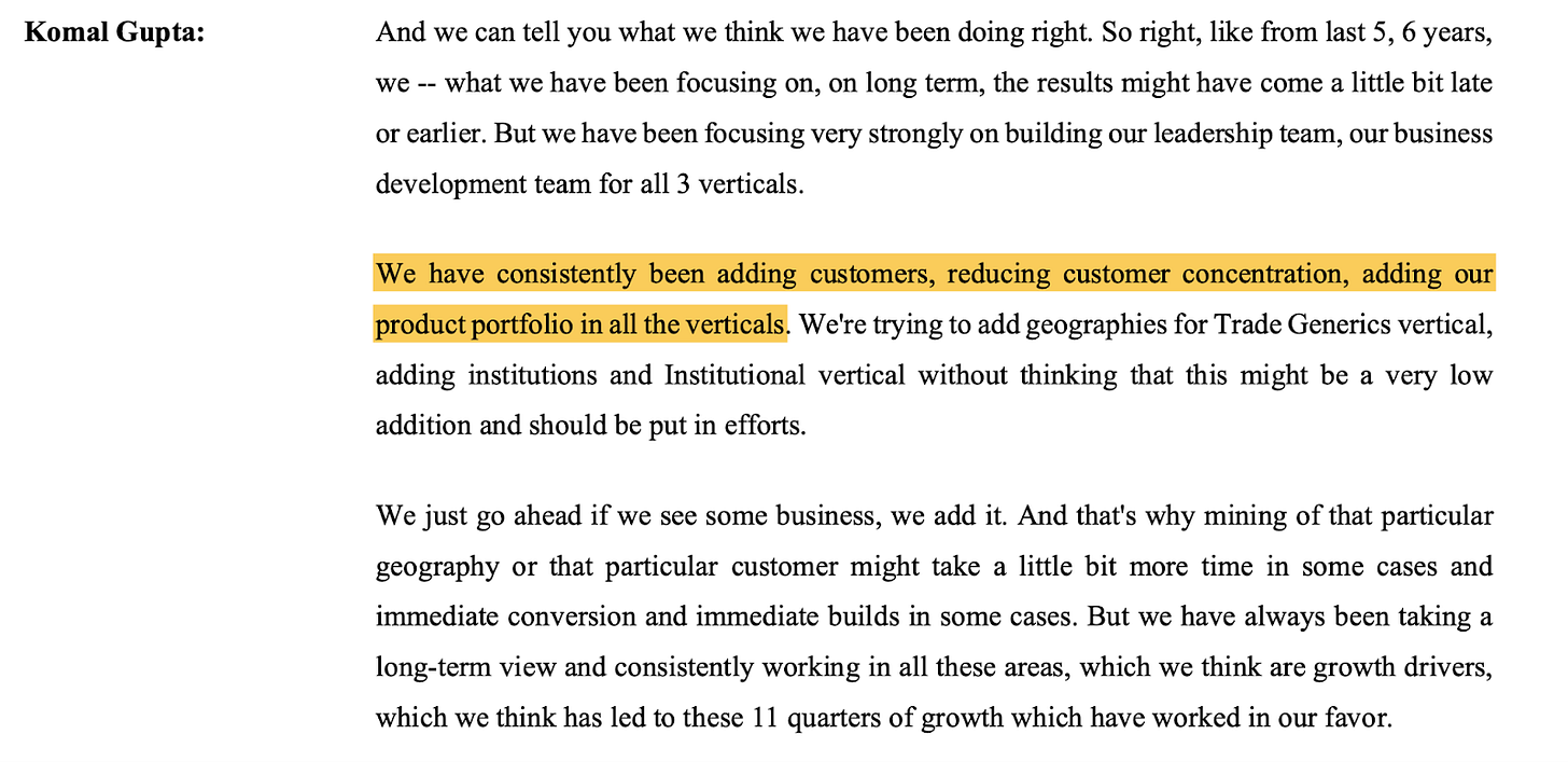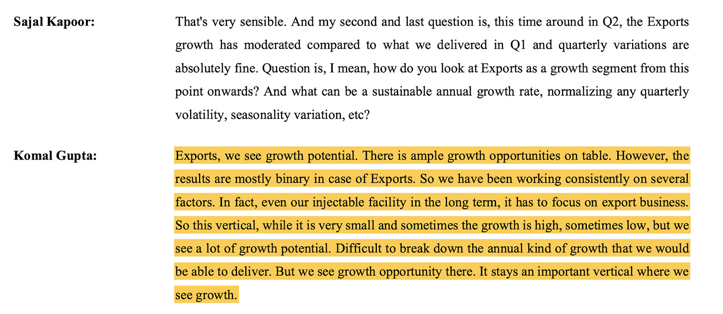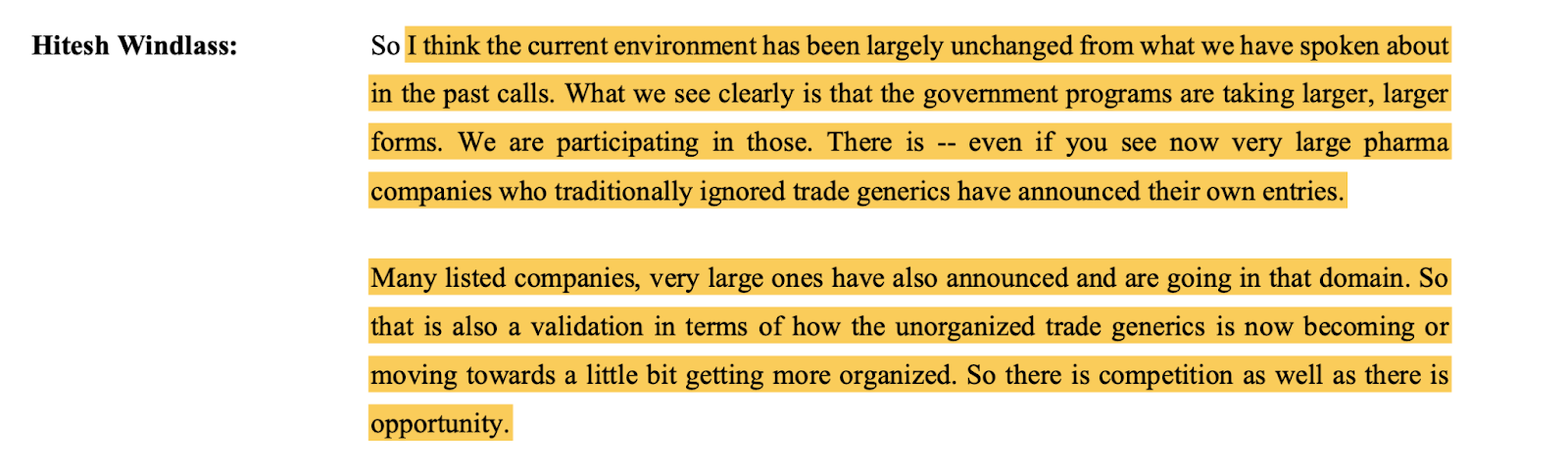 Management notes that the government programs are “taking larger and larger forms,” and Windlas is actively participating in these opportunities. The result is a win win: Windlas gains volume growth and a stable institutional customer base, while the government achieves its goal of reliable supply of inexpensive, quality medicines. (It’s worth noting that even large pharma companies who previously ignored trade generics are now entering this space, which validates the opportunity, though it may increase competition as well).