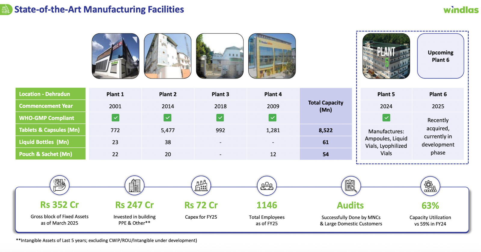 To ensure it can meet rising demand, Windlas is in the process of adding a sixth manufacturing plant (Plant 6) focused on oral solid formulations. This expansion is on track and expected to be commissioned within FY26. Plant 6 will meaningfully boost production capacity management indicated it will increase Windlas’s annual oral dosage manufacturing capacity potential from roughly ₹800 Crore to ₹1,000 Crore in revenue terms (i.e. ~25% capacity addition).