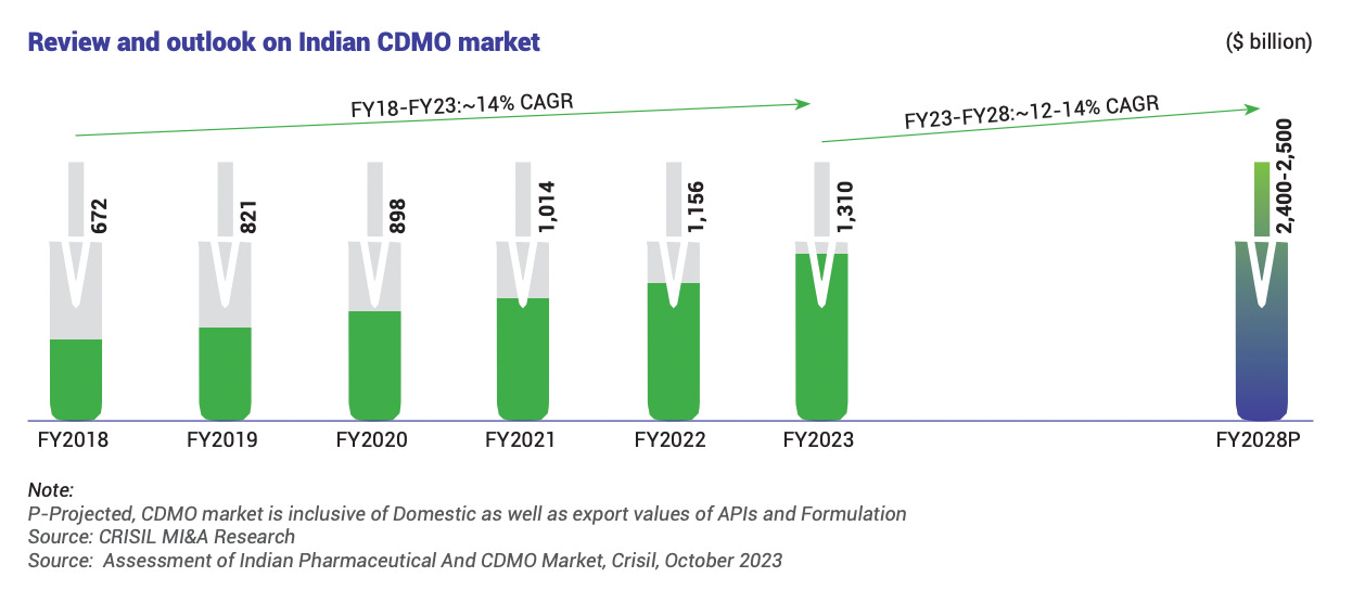 CDMO Industry Outlook: The outsourcing of drug manufacturing is a growing trend in the pharmaceutical industry. Many pharma companies (both in India and globally) are increasingly opting to use specialized manufacturers like Windlas to develop and produce their formulations, rather than investing in expanding their own factories. This allows them to save costs, increase speed to market, and tap external expertise. In India, the pharmaceutical contract manufacturing market has been expanding at a healthy pace it grew at roughly 14% CAGR from 2019 to 2024, and is projected to grow about 12–14% annually going forward, reaching an estimated ₹2,400–2,500 billion size by FY2027 28 (including both domestic and export demand).