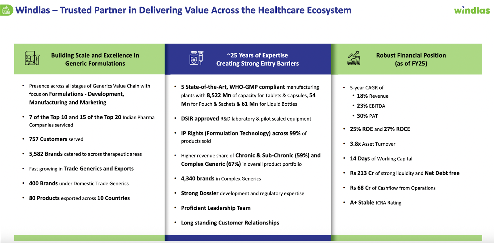Windlas’s financial position is very strong, giving it the firepower to support growth initiatives. The company is net debt free and cash generative as of H1 FY26 it had about ₹237 Crore in liquidity on the books (cash and equivalents), with negligible debt. This healthy cash pile continues to grow from operations (H1 FY26 saw ₹56 Cr cash from operations). Windlas has been funding its capex (such as the injectables plant and Plant 6 expansion) entirely through internal accruals, maintaining a debt free status despite an ₹80–100 Cr capex plan over FY25–FY27. A strong balance sheet not only de risks the company, but also provides optionality for strategic moves.