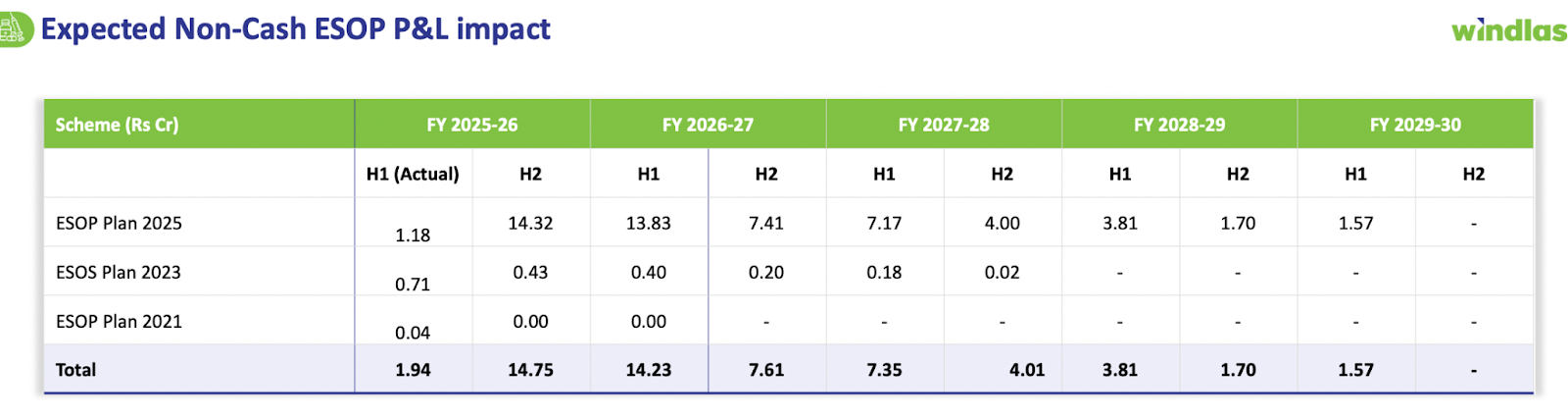 Additionally, Windlas introduced a new ESOP 2025 stock option plan to reward and retain ~100 key employees across various levels. The ESOP grants (awarded in Sep 2025) create a non cash P&L charge, about ₹1.2 Crore in Q2 FY26 was recorded as ESOP expense, and the total ESOP cost will be spread over the next 3 4 years. This has a short term impact on reported profitability. However, management views these steps as investments for future growth: the ESOP scheme is performance linked and meant to “align and empower” key talent for long term value creation, which should ultimately drive better results.