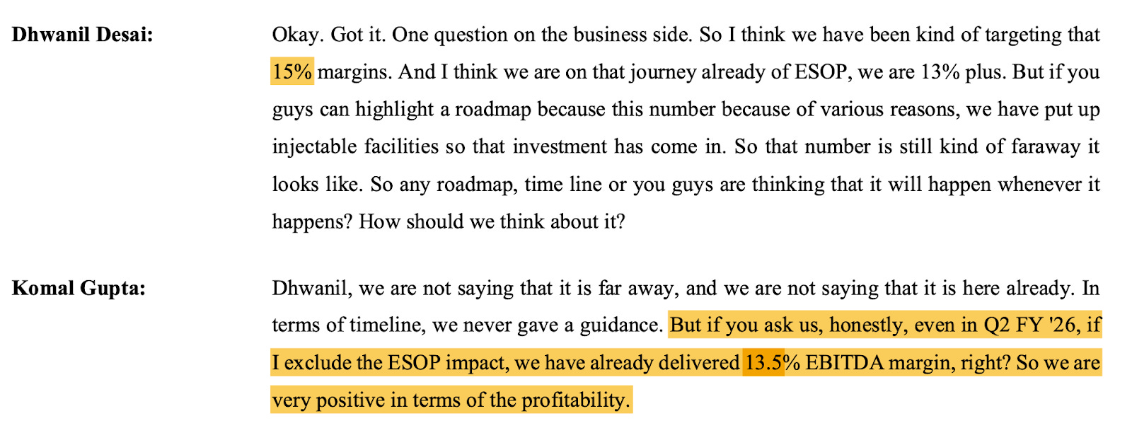 This dynamic is already starting to reflect: in H1 FY26, gross margin improved ~70 bps YoY due to a favorable mix and scale effects, and EBITDA margin expanded despite higher expenses. Management expects overall margins to improve going forward as volumes grow. When asked about the impact of operating leverage over the next 2 3 years, management affirmed that “we expect overall margin improvement” for the company, though without giving a precise number.
